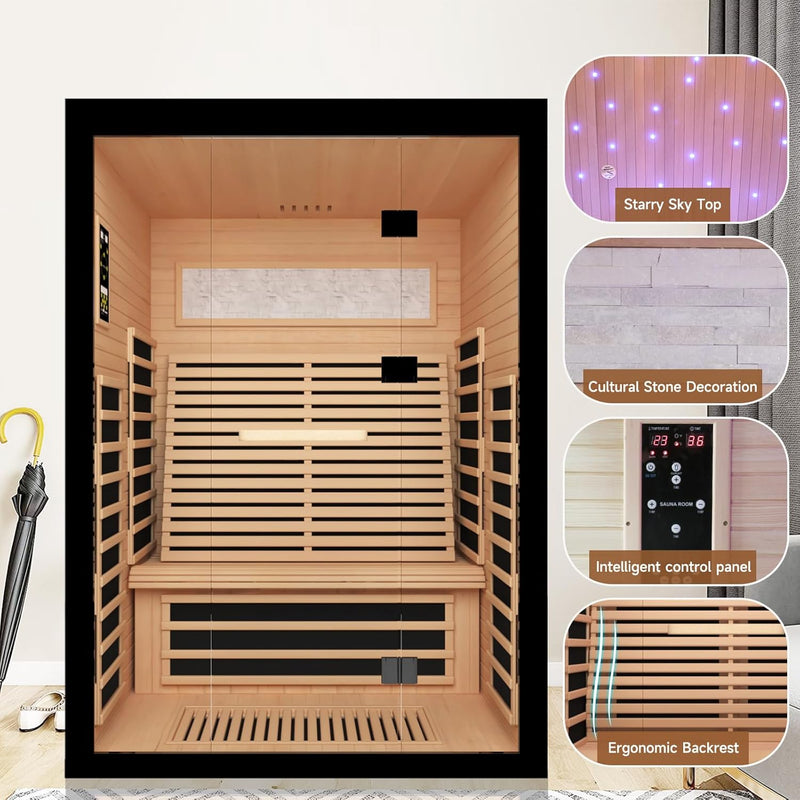 Built-in resonant Bluetooth speakers and adjustable 7-color LED lights create a perfect atmosphere, and the dazzling 21 ceiling starlights exude a romantic atmosphere, allowing you to relax. The explosion-proof overall structure and ergonomic backrest design create a safe and comfortable sauna experience.