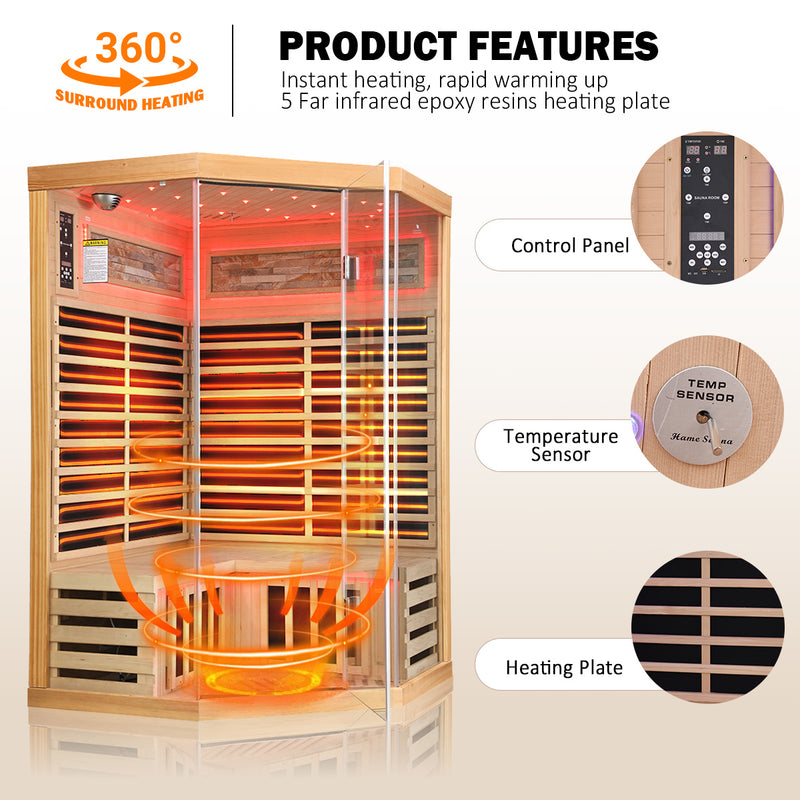 Powered by a 1935W far infrared heating system, seven heating panels surround the body from multiple angles to provide consistent, full-body warmth. The wide square design allows up to three people to sit comfortably without feeling crowded, making it ideal for shared relaxation sessions.