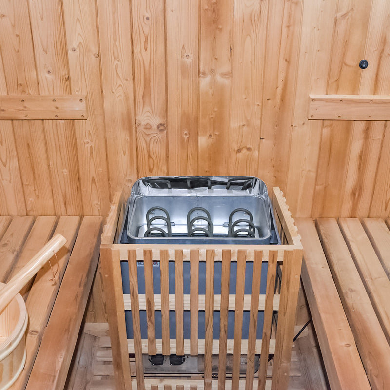 Each sauna includes a complete set of accessories: an LED light with a wooden cover, a vent, an hourglass, a wooden bucket, a wooden spoon, a thermometer/hygrometer, and volcanic stones—everything you need for a perfect steam bath.
