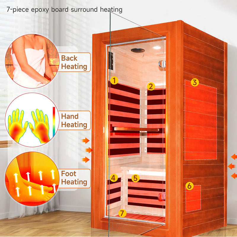 Equipped with 7 low-EMF carbon fiber heating panels, the far infrared power of 1080W can evenly wrap your body and produce warmth up to 149°F. It is well known that the benefits of a sauna include improved blood circulation, relief of muscle fatigue, detoxification, and stress reduction.