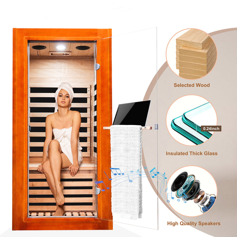 This sauna is made of premium Okoume wood and tempered glass doors, with a smooth, skin-friendly surface and beautiful finish. Its small size makes it easy to integrate into any home space while still providing a comfortable sauna experience. The front glass door provides a wide view, and people with claustrophobia don't have to worry.