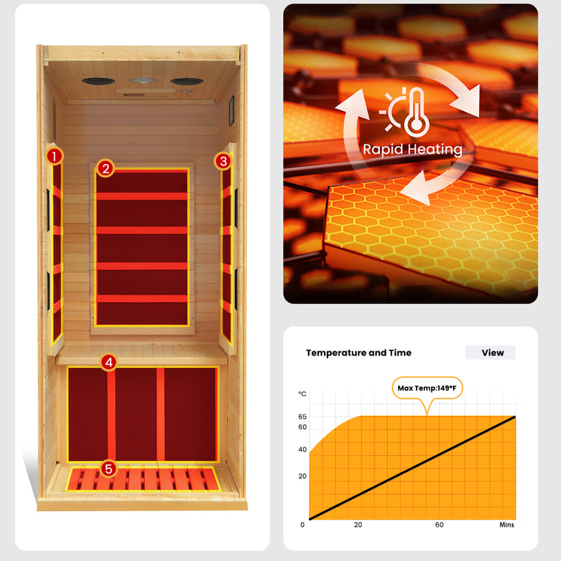 Bring the luxury of private wellness to your home with the Outexer HY1 Indoor Single Person Infrared Sauna. Made from premium Canadian hemlock wood, this compact sauna is equipped with low-electromagnetic field infrared heating panels. Measuring 33" x 28" x 62", it is perfect for smaller rooms and spaces and heats to 149°F (65°C) in 30 minutes. Enjoy your favorite music through the built-in dual-speaker entertainment system, while the oxygen bar function can enhance your experience during the sauna.